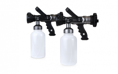 Absperrbares, optimal auf F-500 EA abgestimmtes Hohlstrahlrohr mit fixer Durchflussmenge zur Abgabe von Löschwasser in Form von Vollstrahl und winkelveränderlichem Sprühstrahl bei gleichzeitigem selbsttätigem Ansaugen unseres Löschmittelzusatzes in kontinuierlich einstellbaren Saugraten.